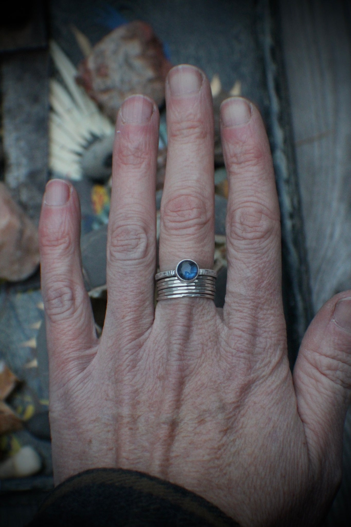 Labradorite round measures 8mm diameter and is a size 7 on a band much like my 'fatty stack' style. Great for stacking up or wearing as one. OOAK.