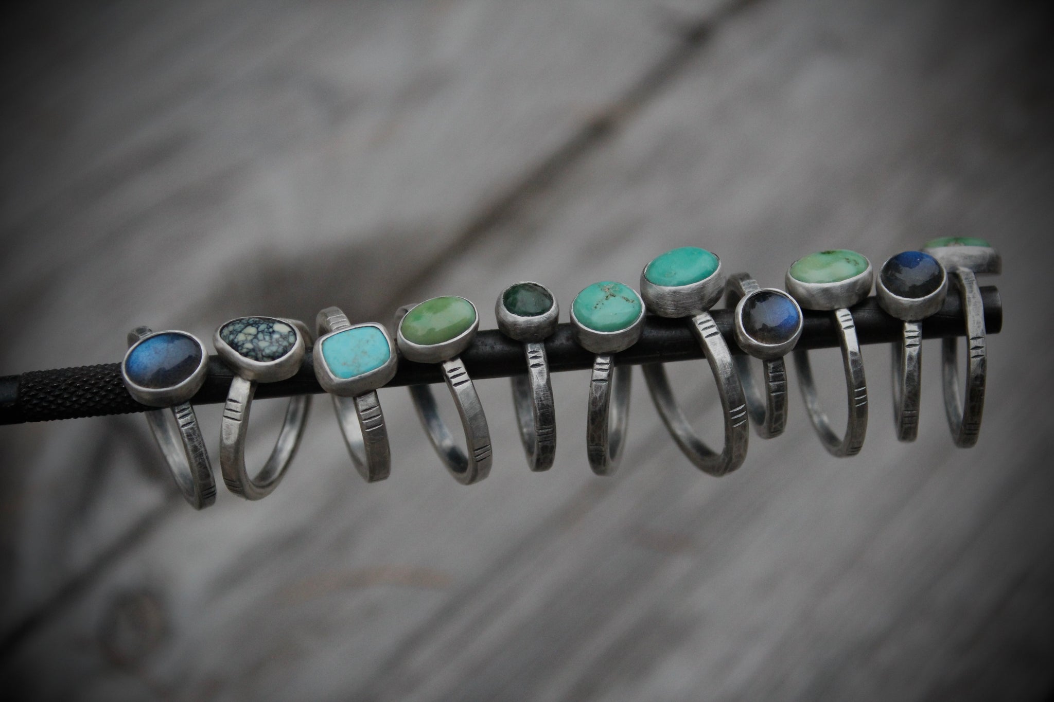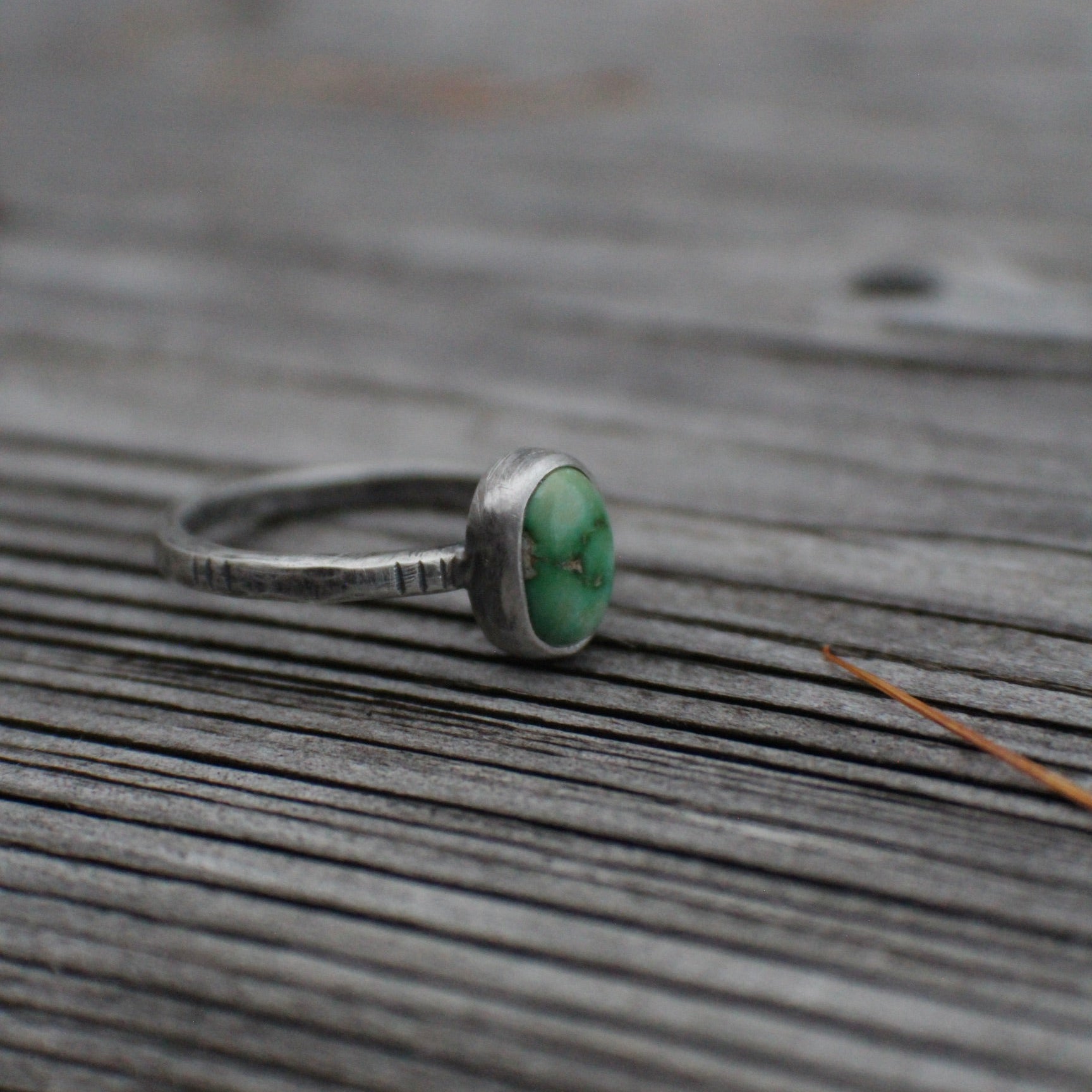 Turquoise oval measures 6x8mm diameter and is a size 7.25 on a band a little thinner than my 'fatty stack' style. Great for stacking up or wearing as one. OOAK.