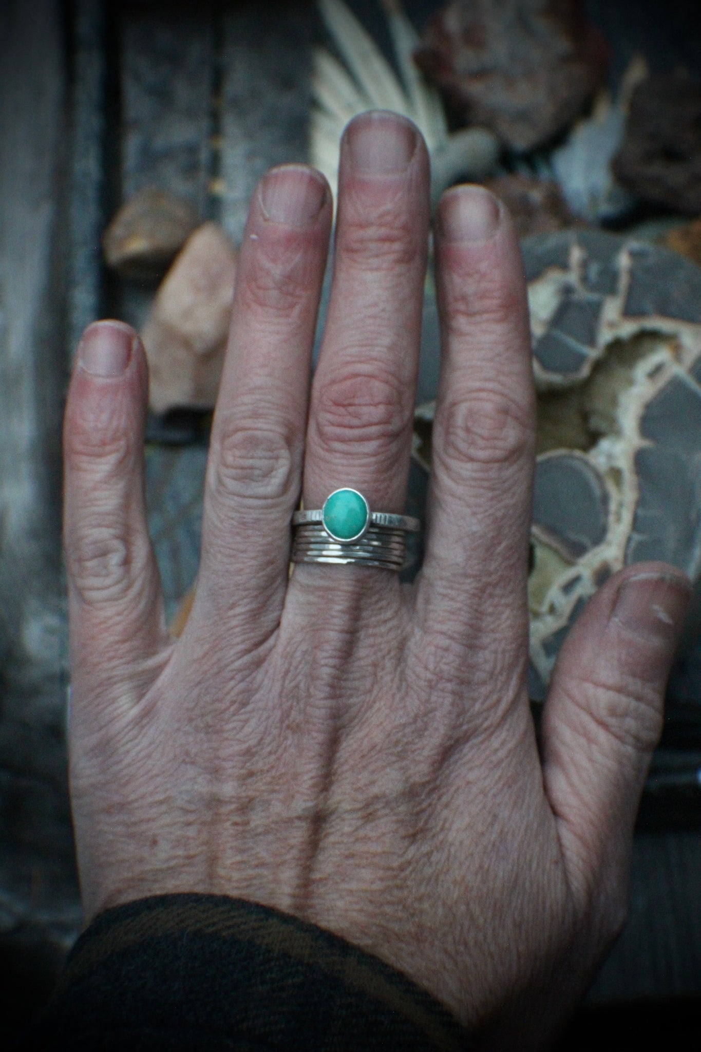 Turquoise round measures 10mm diameter and is a size 9 on a band a little chunkier than my 'fatty stack' style. Great for stacking up or wearing as one. OOAK.