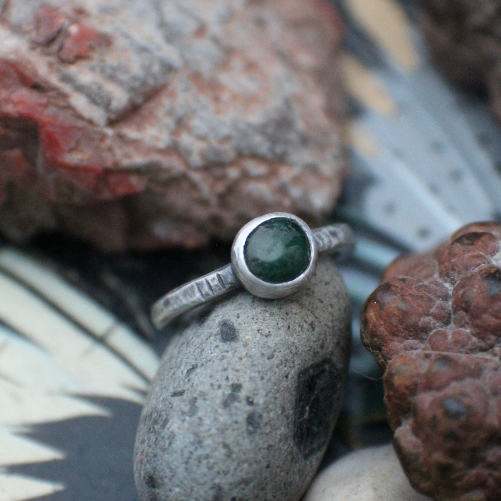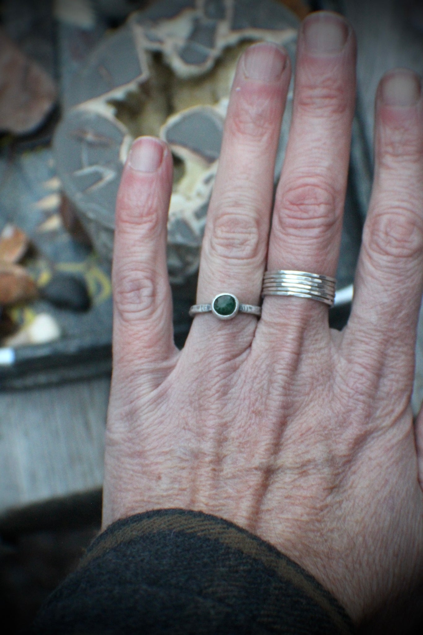 Emerald material with brown inclusions, native faceted round measures 7mm diameter and is a size 6 on a band a little thicker than my 'fatty stack' style. Great for stacking up or wearing as one. OOAK. I'm not sure where this stone came from, but her facets sure do sparkle!