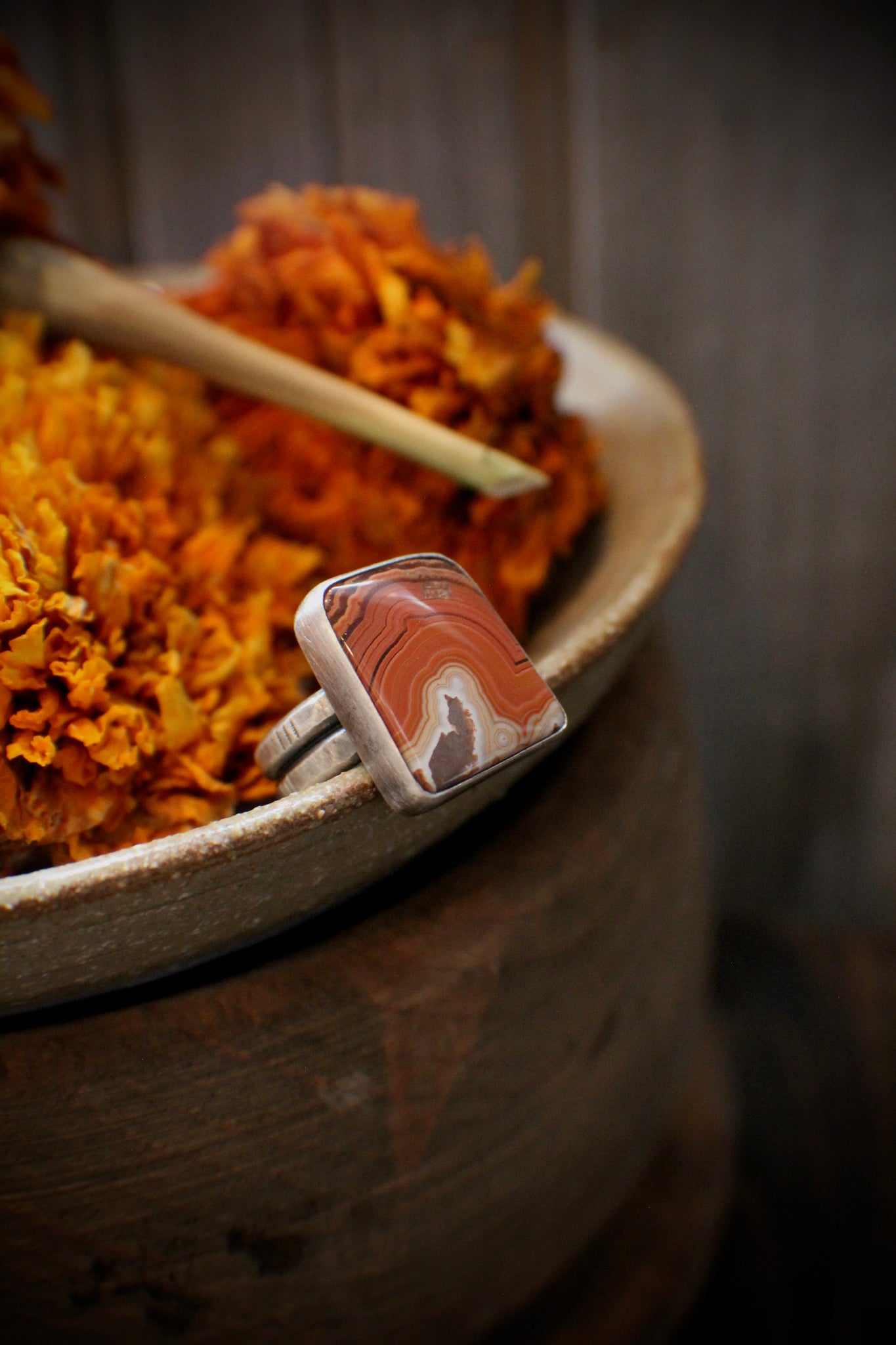 OOAK ring in a very simple setting, no frills here! She's a 5.5 on 6mm double half round band, my favorite and most comfortable material for a big ring. She's big, bold, and so comfortable! Ring measures 1/2x3/4" rectangle. My signature coin is on the backplate.