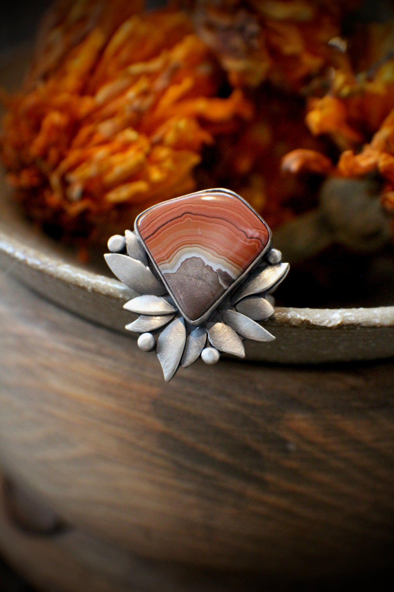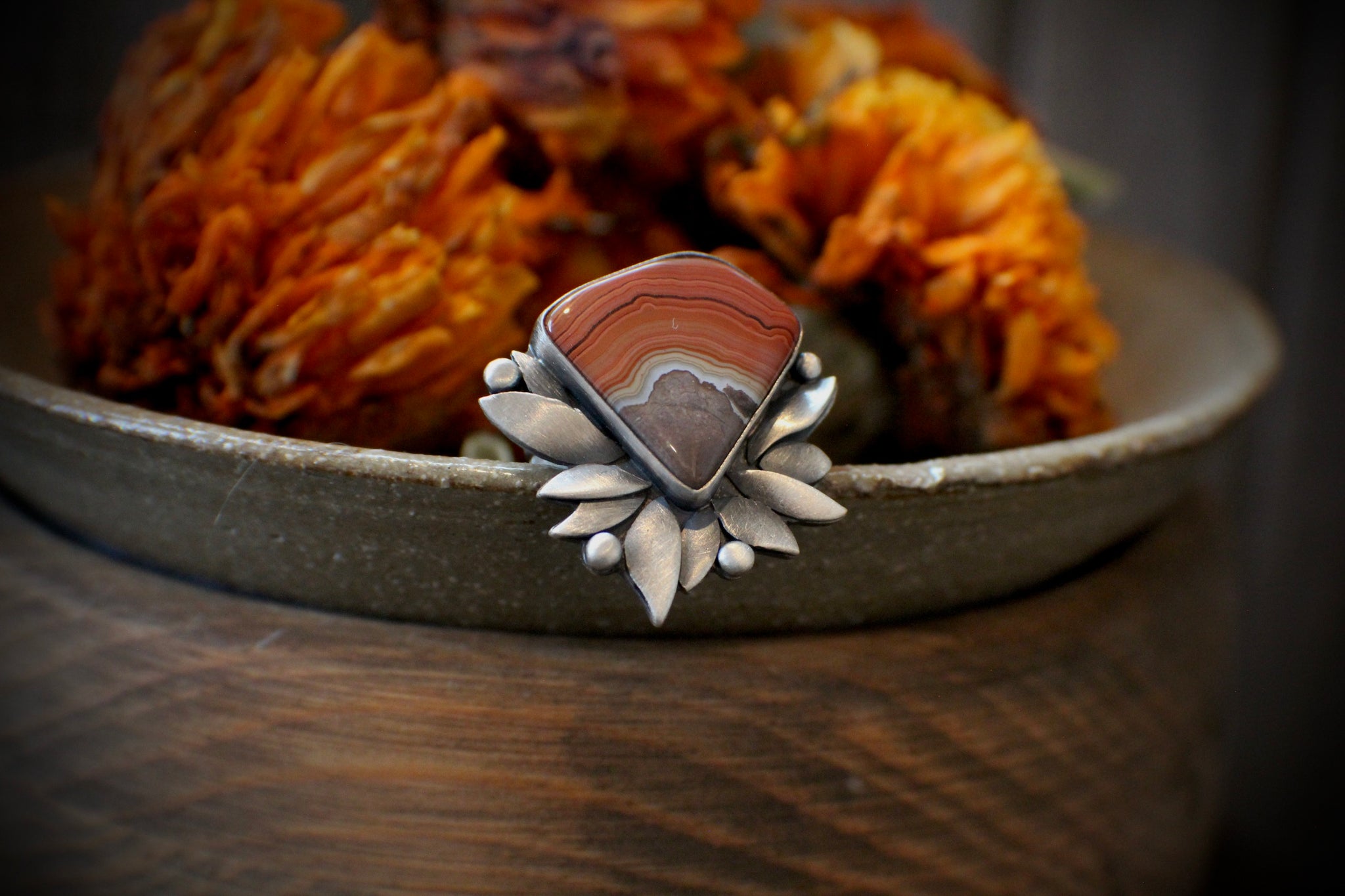 OOAK floral motif ring size 7.5 on 6mm double half round band, my favorite and most comfortable material for a big ring. She's big, bold, and so comfortable! Ring measures 1 1/4" at her widest. My signature coin is on the backplate. This floral motif is inspired by the plains of the east side near Livingston, just add some wild sage and wind!
