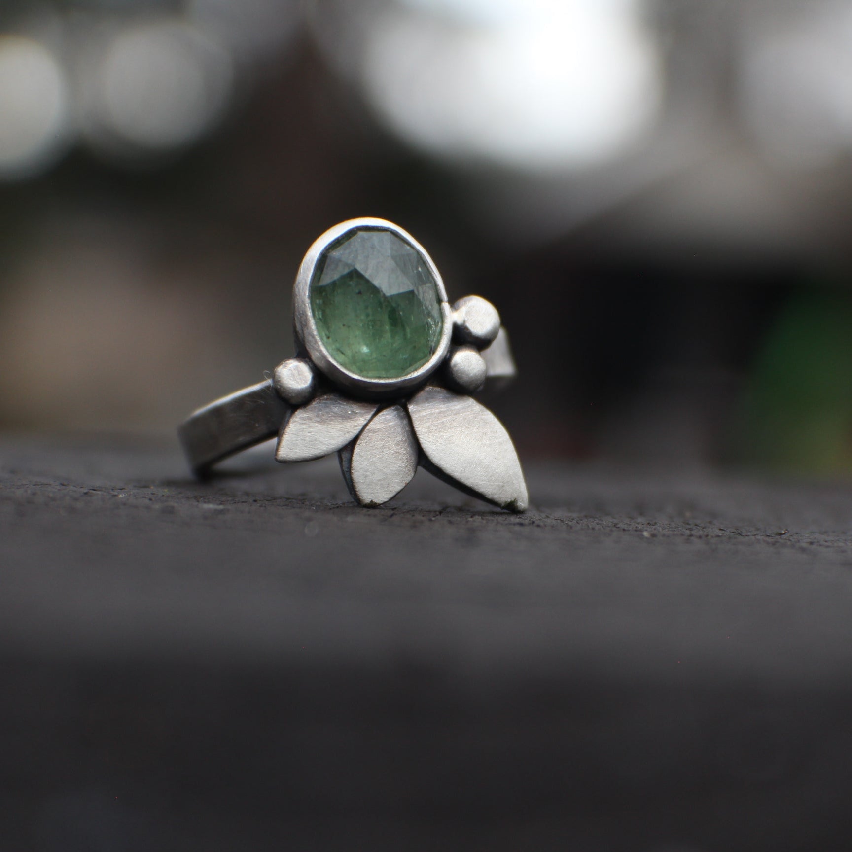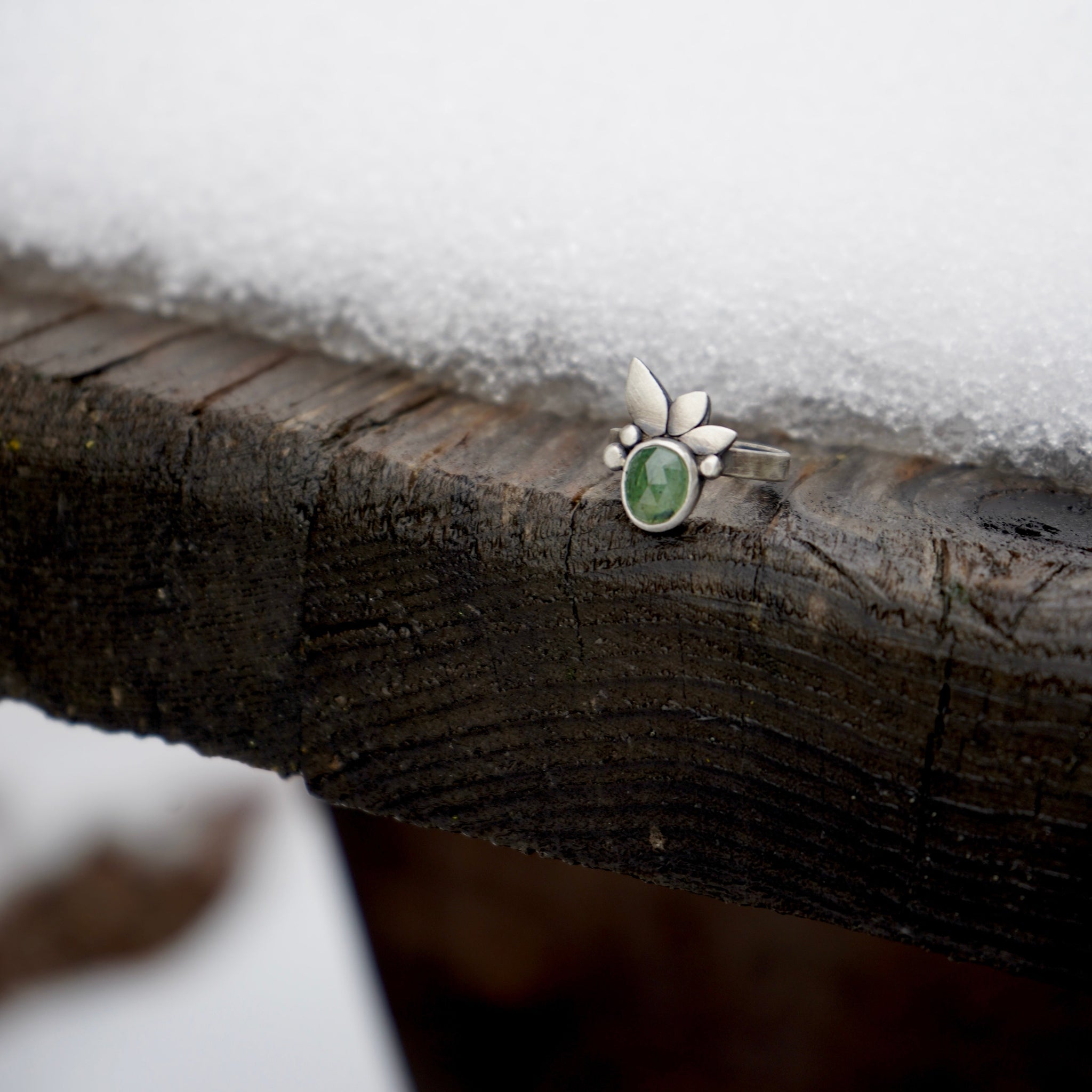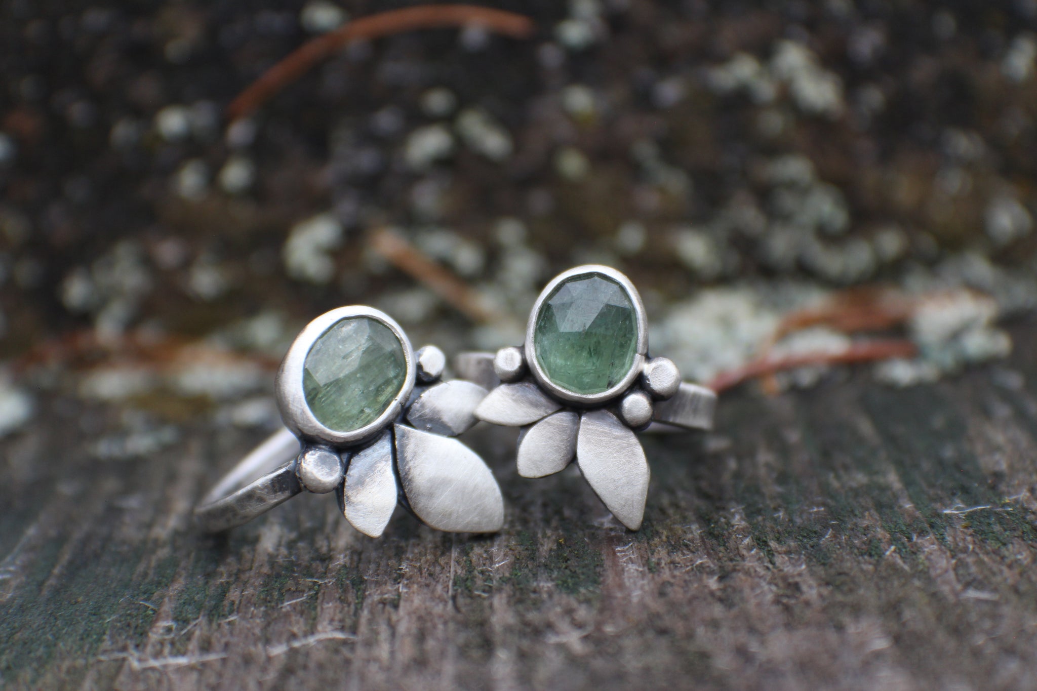 Ring set in fine and sterling silver, in a classic R&S 'seedling' motif! These stones have a faceted face, so are hard to photograph, but they range from deep jungle green to icy light greens in certain lighting, and sparkle like nobody's business. This ring is on a simple hammered band 3mm wide, and stone measures 7x10mm. Entire face measures 19mm.