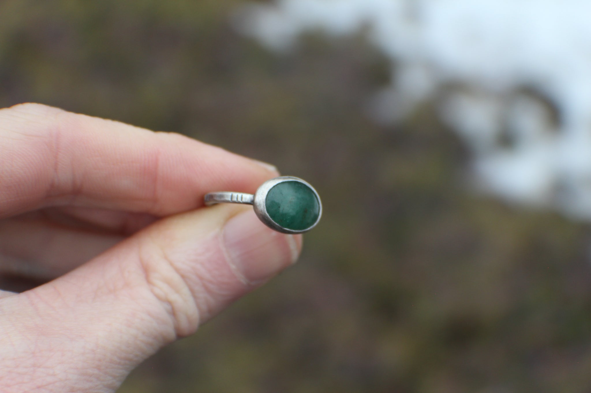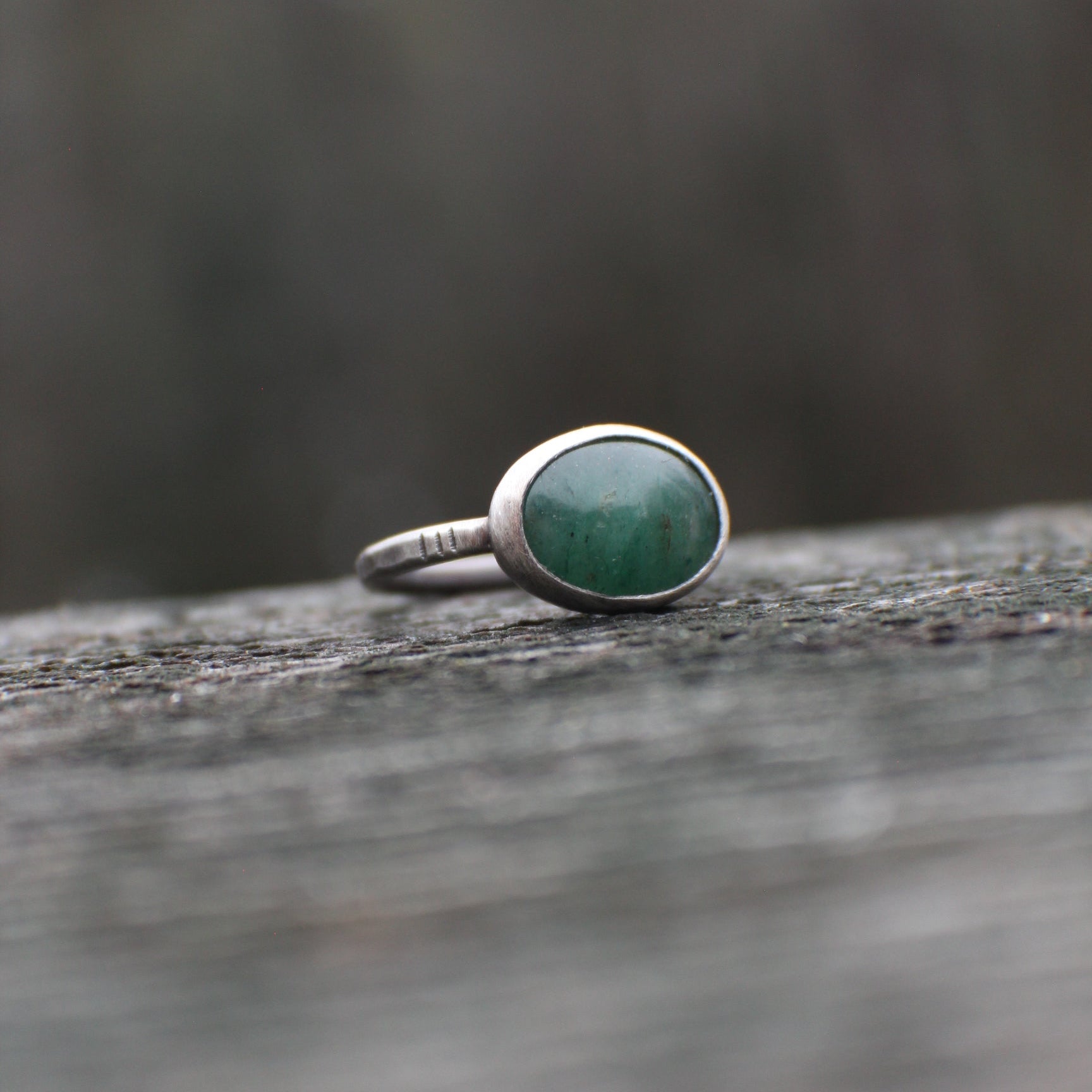 Simple stone ring on a sweet simple band, I believe this stone is Green Jasper. Size 7. Measures 9x14 face with a thin 2mm hammered band. OOAK for Spring Equinox!